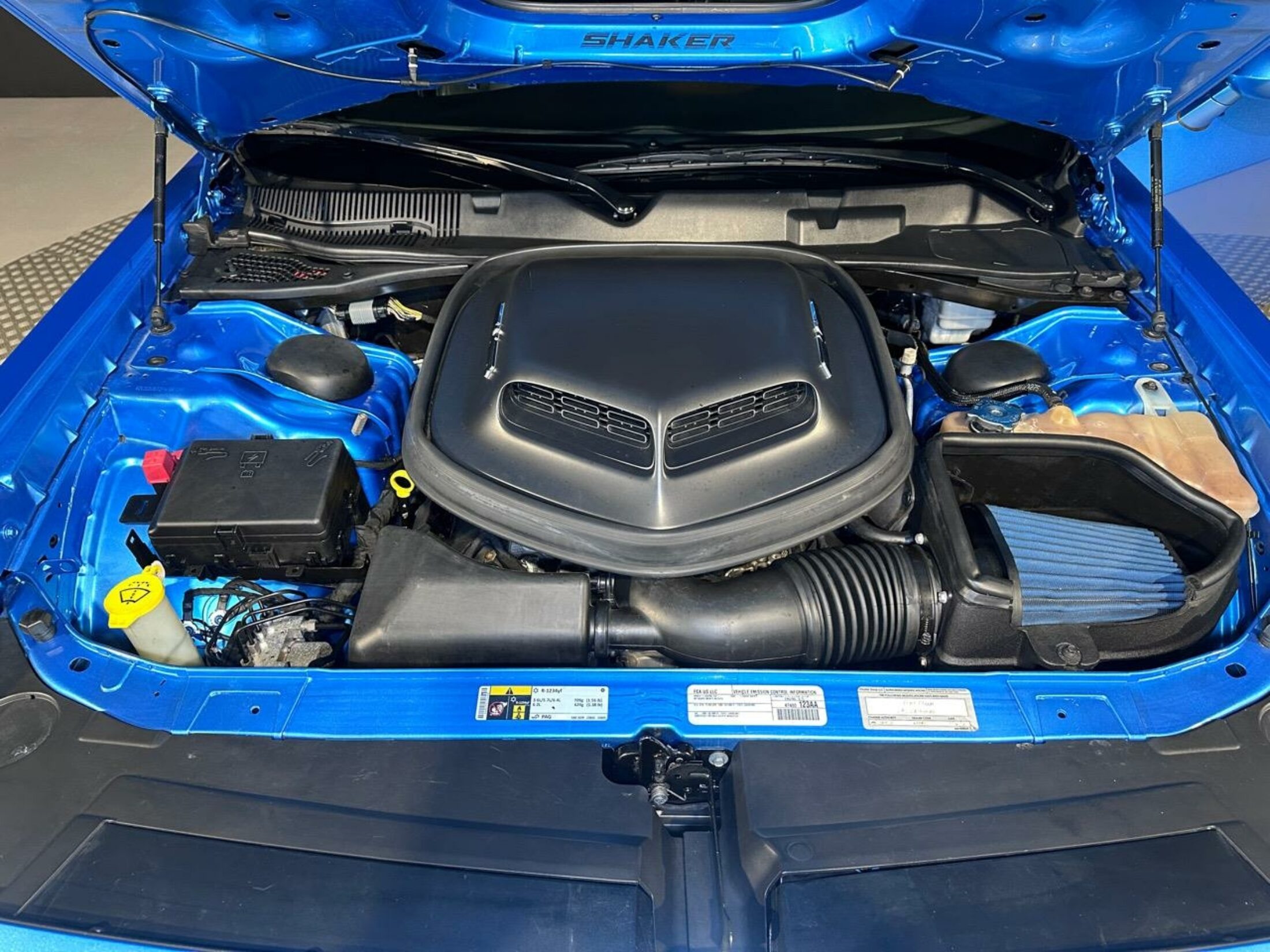 - Engine mounted Shaker hood scoop with Mopar cold-air intake and conical filter, honouring the classic 1970s style.