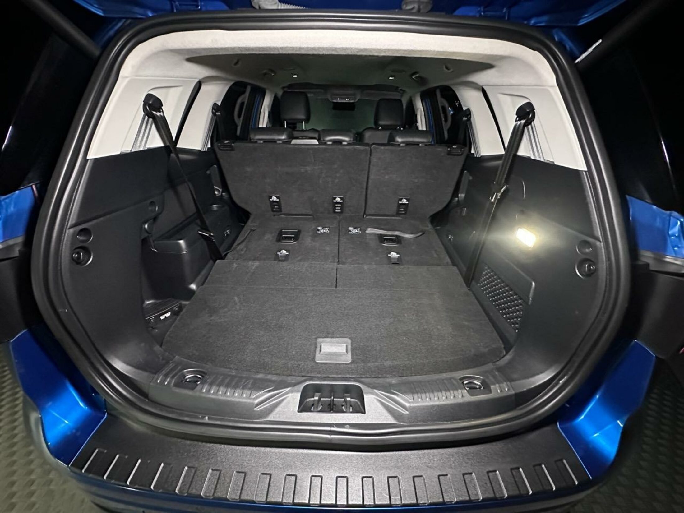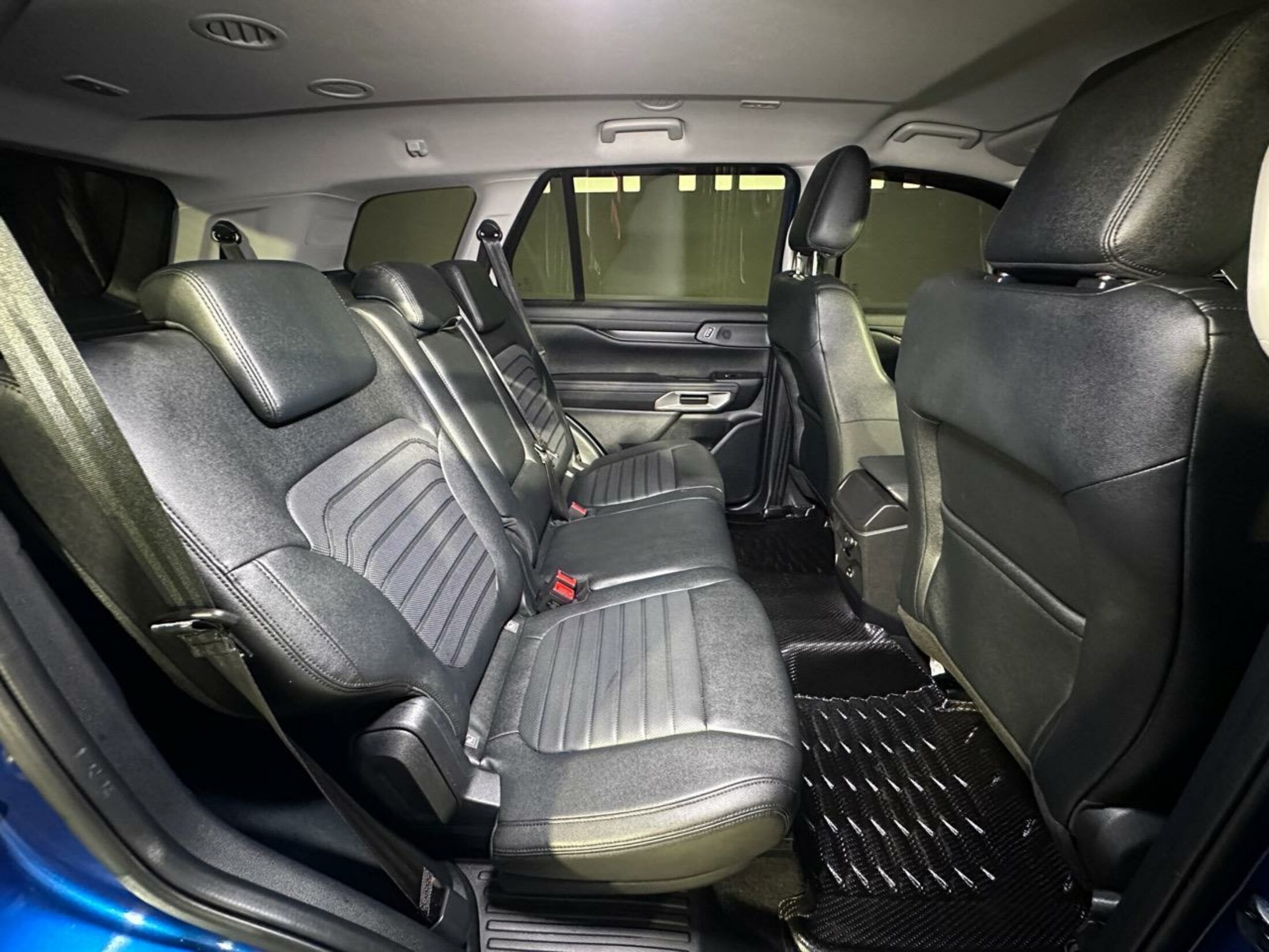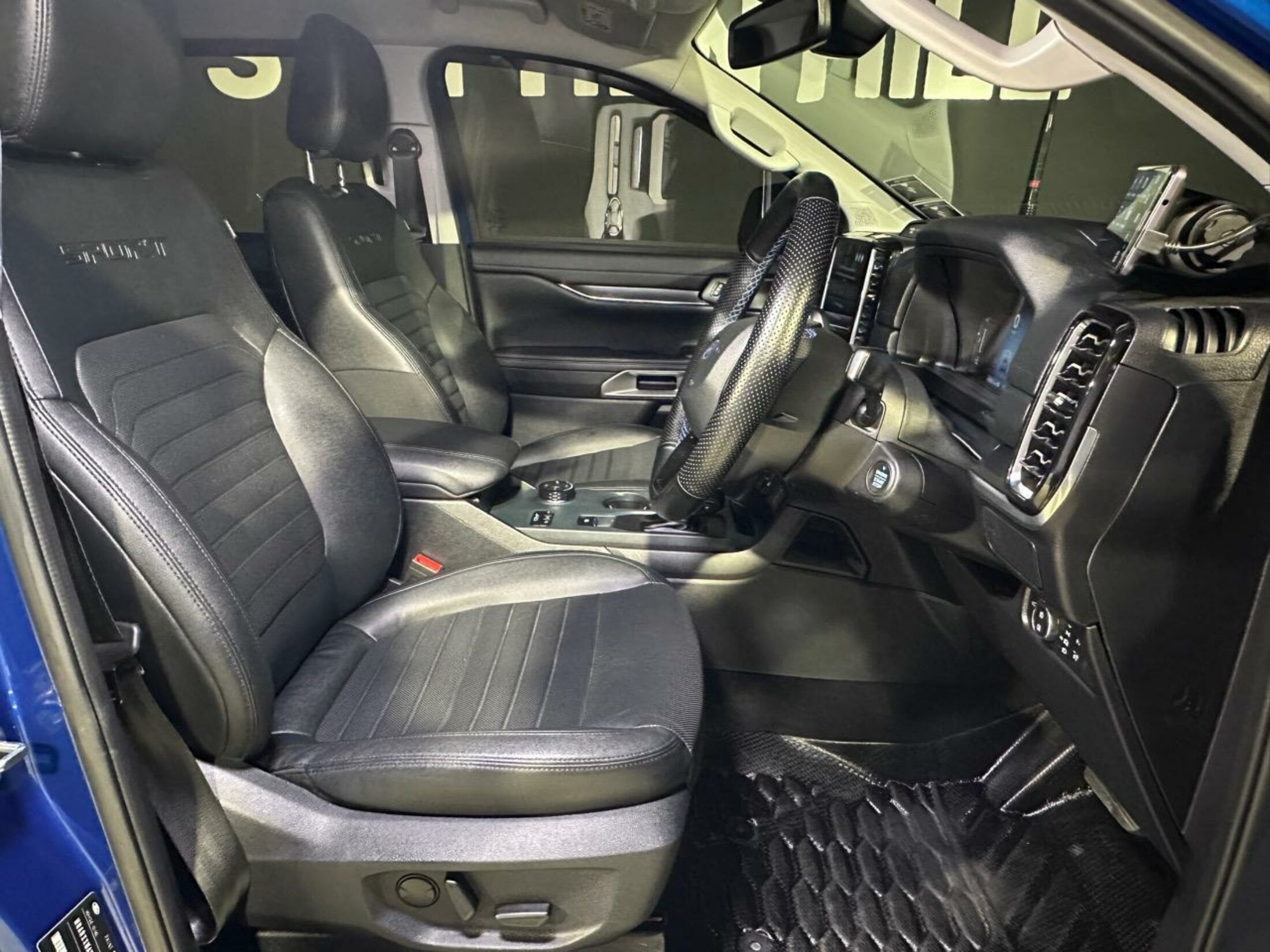 - Custom steering wheel with blue stitching